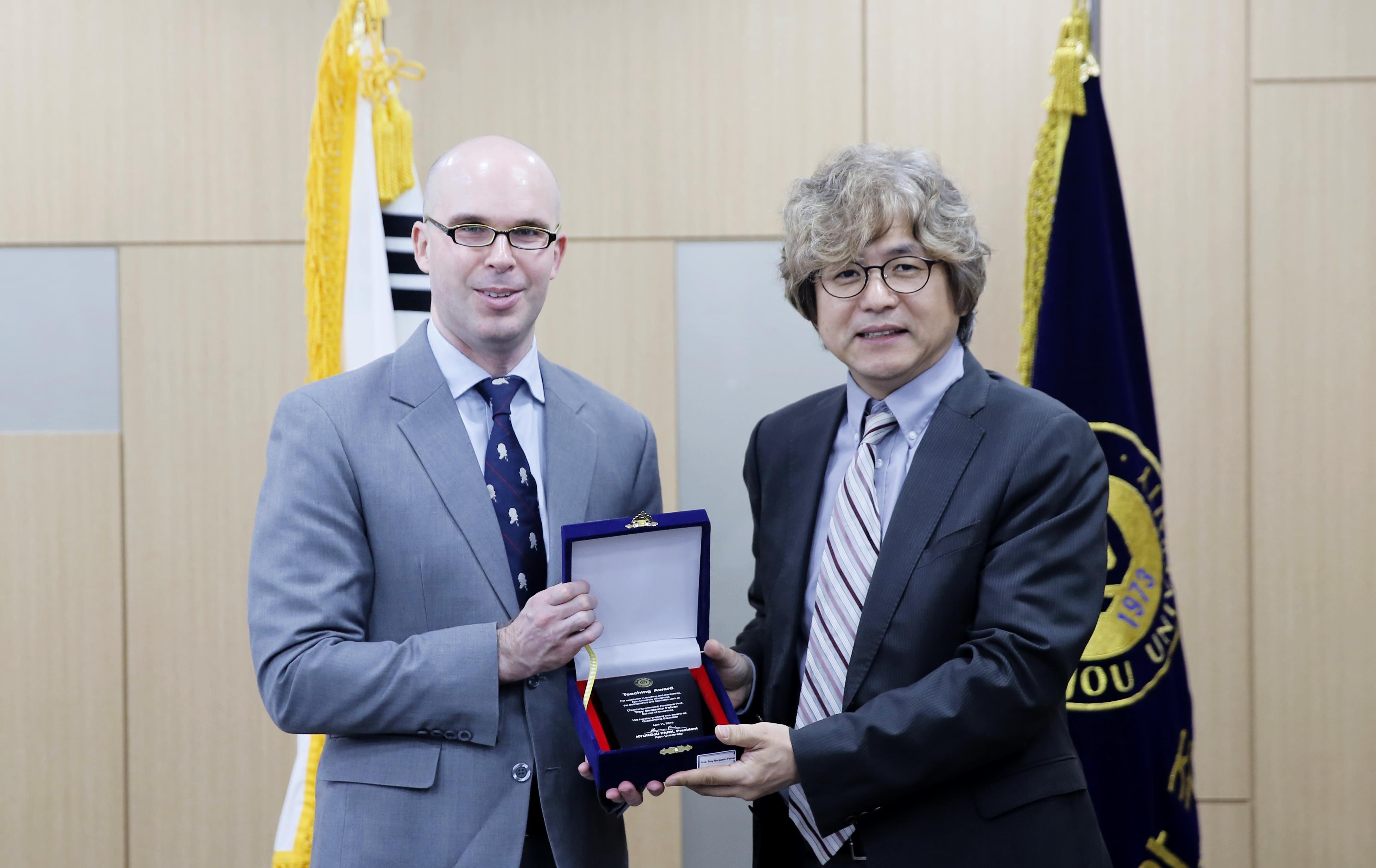 2018학년도 대우장학 수여식이 4일 오전 율곡관 영상회의실에서 열렸다. 각 단과대학 수석들에게 등록금 전액을 수여하는 대우장학은 1993년부터 시작해 올해로 25째를 맞았다. 대우장학은 지금까지 총 1849명에게 장학금을 전달했으며 금액은 총 60억원에 달한다. 수여식에는 38명의 장학생들을 비롯해 추호석 대우학원 이사장과 대학장학재단 이사진, 박형주 총장 그리고 각 대학 학장, 처장 등이 참석했다. 행사는 조재형 학생처장의 대우장학 현황보고를 시작으로 대우장학 기념영상 시청, 장학증서전달, 장학생 대표선서와 감사인사, 축사 등의 순서로 진행됐다. 한승현(인문대, 3학년) 학생은 장학생들 대표로 나서 대우장학재단과 관계자들에게 미리 준비한 글을 낭독해 감사의 뜻을 전하며 “대우장학생으로서 인간존중의 의미를 되새기고 사회에 도움이 되는 아주인이 되겠다”고 다짐을 하기도 했다. 추호석 이사장은 ‘인생은 점들의 연속’이라는 스티브 잡스의 말을 인용하며 “우리가 매일 찍는 점들이 어떻게든 연결이 된다. 오늘 장학수여식이 더 큰 미래, 원대한 꿈 실현을 위해 나아가는 변화의 시작점이 되기를 바란다”고 당부했다. 박형주 총장도 장학생들을 축하하면서 “시행착오를 두려워하지 않는 개척자 정신으로 급변하는 환경에 유연한 사고로 대처할 수 있는 아주인이 되었으면 한다”고 당부했다. ▲ 공과대학 곽준(1학년), 윤정현(2학년), 김광덕(3학년), 양창현(4학년)▲ 정보통신대학 임준혁(1학년), 윤석진(2학년), 최서연(3학년), 황의권(4학년)▲ 자연과학대학 고명호(1학년), 윤현지(2학년), 김혜인(3학년), 이건(4학년)▲ 경영대학 서장원(1학년), 송태우(2학년), 신문기(3학년), 박정후(4학년)▲ 인문대학 김현탁(1학년), 우수민(2학년), 한승현(3학년), 이태경(4학년)▲ 사회과학대학 김현일(1학년), 임호준(2학년), 김태남(3학년), 최동현(4학년)▲ 약학대학 김은아(1학년), 정태석(2학년), 이정은(3학년), 조윤교(4학년)▲ 의과대학 강준구(1학년), 박현호(2학년), 최현일(3학년), 이현승(4학년), 박효경(5학년), 김민지(6학년)▲ 간호대학 이승민(1학년), 한동민(2학년), 문지호(3학년), 이소연(4학년)