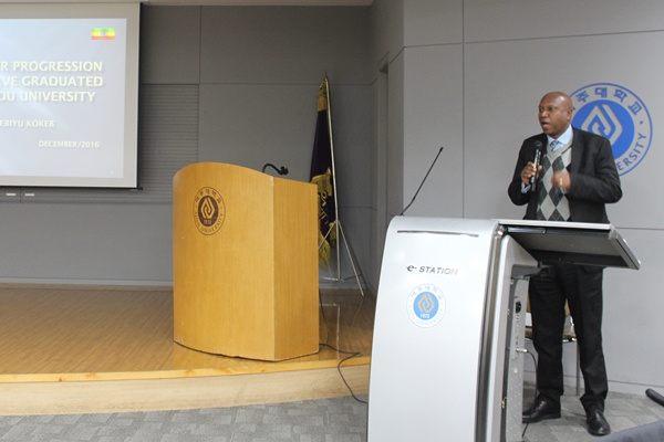 국제대학원이 KOICA(한국국제협력단)로부터 위탁운영 중인 석사학위과정 졸업동문 초청행사를 12월 5일부터 10일까지 5박 6일간의 일정으로 가졌다. 이번 행사는 KOICA 석사과정 졸업생들을 통해 교육과정의 우수성을 확인하고, 교육내용의 성공적인 적용사례를 지속적으로 만들어갈 목적으로 개최됐다. 초청된 동문들은 2004년부터 현재까지 석사학위과정 졸업자들 중 본국에서 교육내용을 본인의 업무에 적용하거나 실천한 사례 또는 한국의 경험을 강연한 사례를 공모해 선발된 인원들이다. 행사기간동안 초청동문들은 발표를 통해 자신들의 사례를 공유했으며 재학생들이 세운 ‘졸업 후 현업적용계획’을 듣고서 의견을 나누는 등 교류의 시간을 가지기도 했다. NEBIYU KOKEB LEMECHA(에티오피아 조달청 국장, 2005년 졸업)는 한국의 조달청과 MOU협약을 맺고 한국의 공공조달서비스(PPS)를 벤치마킹해 에티오피아에 전파한 사례를 발표했다. KRISHNA PRASAD DHAKAL(주인도 네팔 대리대사, 2007년 졸업)도 한국에서 재학중이던 시절 30개국 이상의 다른 국적 학생들과 교류한 경험이 현재 주인도대리대사로 업무를 수행하는데 도움이 된다고 발표를 했다. 초청동문들은 경기창조경제혁신센터, 인천경제자유구역 등을 견학하고, 동문회의 밤 행사를 가지는 등 아주대 국제대학원과 KOICA가 공동으로 계획한 일정을 소화했다.