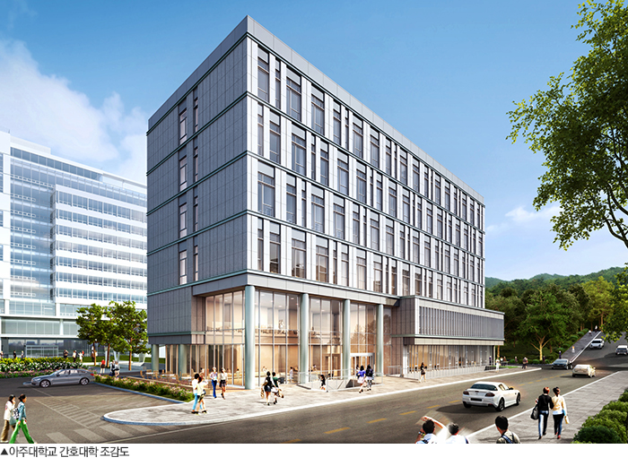 우리 학교 간호대학 건물 신축을 위한 기공식이 13일 오후 열렸다. 간호대학 건물은 종합관과 송재관 공간에 7층 건물로 준공될 예정이다.이날 기공식에는 김동연 총장과 이영현 학교법인 대우학원 상임이사, 유희석 의료원장, 풍림산업 이필승 대표이사 등이 참석했다.이번에 신축하는 간호대학 건물은 2018년 5월 준공될 예정이다. 9235㎡(2793평) 부지에 141억원을 들여 첨단 간호실습실, 시뮬레이션실, 세미나실, 강의실, 연구실험실 등을 갖춘 지상 7층 건물로 건립된다.우리 학교 간호대학은 1998년 120명의 신입생이 첫 수업을 했고 현재까지 정규과정과 특별과정 총 2215명의 졸업생을 배출했다. 2014년 전국 간호대학 평가에서 우수한 성적을 기록했고, 한 해를 제외하고는 매년 국가고시 전원 합격의 성적을 거뒀다.김동연 총장은 “짧은 시간에도 헌신과 열정으로 새로운 역사를 써가고 있는 간호대학의 건립은 아주대학교가 추진하는 유쾌한 반란에 한층 힘을 더하고 시너지를 낼 것”이라고 말했다.유희석 의료원장은 “간호대학 건물이 완공되면 교육과 연구 환경이 크게 개선되어 ‘차세대 간호인재를 육성하여 전국 최고의 간호대학’을 만든다는 목표에 성큼 다가서게 될 것”이라고 전했다.