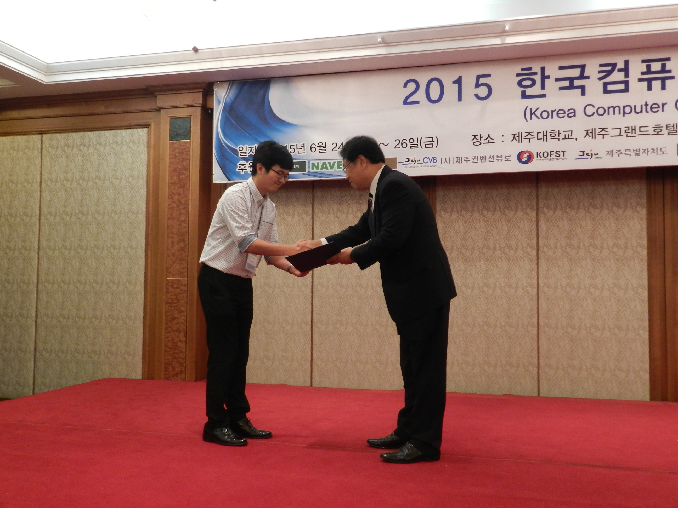 전자공학과 이정원(좌측 사진) 교수와 박사과정의 최기용(우측 사진) 학생이 한국정보과학회의 ‘컴퓨팅의 실제’ 분야에서 우수논문상을 수상했다. 한국정보과학회는 정보과학논문지에 실린 논문들 중 매년 5개 분야에서 한 편씩을 우수 논문으로 선정하고 있다. 올해 ‘컴퓨팅의 실제’ 분야에는 110편의 논문이 경합을 벌였다. 수상 논문은 2014년에 발표한 ‘모바일 기기의 전력측정을 위한 휴대용 시스템’이다. 논문에 따르면 이 교수팀이 개발한 시스템을 통해 이동 중인 모바일 기기의 정확한 전력측정과 분석이 가능해져 효율적으로 전력을 사용할 수 있게 돼 향후 사물인터넷(IoT)을 위한 모바일 상황인지 기술의 가능성을 높이게 됐다. 한편, 시상식은 지난 6월 25일 제주도에서 열렸다.
