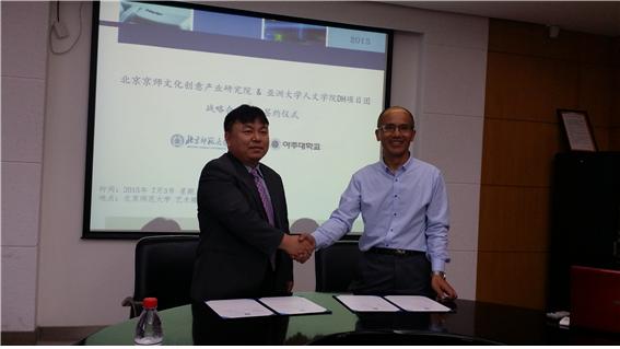우리 학교 인문 대학 특성화 사업단인 ‘디지털 휴머니티 사업단(단장 정경훈 교수)’이 중국 북경사범대 소속 경사문화창의산업연구원(京師文化創意産業硏究院)과 MOU를 체결하고 상호협력을 본격화하기로 했다. 지난 3일 북경사범대 경사문화창의산업연구원에서 열린 MOU 체결식에는 이상신 교수(국어국문학과), 언규 교수(문화콘텐츠학과)가 참석했다. 북경사범대 측에서는 샤오용량(肖永亮) 원장, 리유징(Fayee, 刘静) 북경사범대 문화창의산업연구원 학술연구부 주임 등이 함께 자리했다. 북경사범대 경사문화창의산업연구원은 북경사범대학교와 북경시 선전부가 함께 설립한 산-학-연 일체화 기관이다. 지난 2008년 9월 설립되어, 북경시의 문화산업 육성 정책과 교육을 지원하는 씽크탱크로 북경시로부터 연구지원을 받고 있다. 이번 MOU를 계기로 우리 학교 ‘디지털 휴머니티 사업단’뿐 아니라 인문대 소속 문화콘텐츠학과와의 협력이 더욱 확대될 것으로 기대된다. 한편 우리 학교 디지털 휴머니티 사업단은 중국 북경사범대에 이어 북경대 문화산업연구원을 방문하여, 향후 학생 상호 교류 세미나를 위한 협의도 진행하였다. 디지털 휴머니티 사업단은 지난해 교육부가 추진하는 대학 특성화 사업(CK사업, University for Creative Korea)에 선정된 우리 학교 6개 특성화 사업단 가운데 하나다. 인문대 문화콘텐츠학과와 국어국문학과가 주축이 되어 인문학과 문화콘텐츠의 선순환적 융합교육을 위해 힘쓰고 있다.