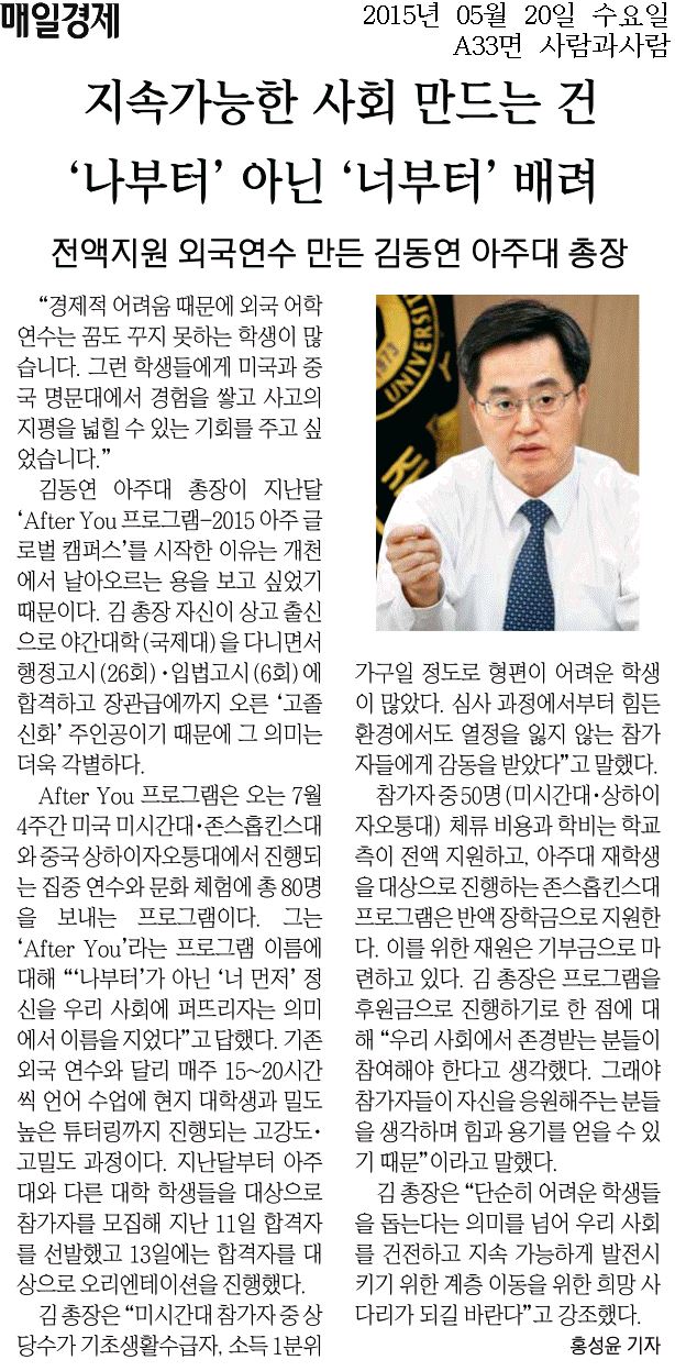 15일 율곡관 영상회의실에서 2015학년도 1학기 ‘아경장학 장학증서 수여식’이 열렸다. 아경장학재단은 우리 학교 경영대학원 총동문회가 2007년 설립한 장학재단이다. 이날 장학증서 수여식에는 21명의 장학생과 김형균 아경장학재단 이사장을 비롯한 아경장학재단 관계자, 김동연 총장을 비롯한 학교 관계자가 참석했다. 행사는 ▲아경장학재단 경과보고 ▲장학증서 수여 ▲김형균 아경장학재단 이사장 격려사 ▲김동연 총장 축사 순으로 이어졌다. 양기운 학생은 장학생 대표로 감사의 글을 낭독했다. 이번 학기 아경장학금을 받게 된 학생은 총 21명이다. 아경최고장학생으로 이재연(법학전문대학원), 송민형(건설시스템공학과), 조동현(전자공학과), 김환식(물리학과), 양기운(경영학과), 강민아(영어영문학과), 정수빈(경제학과) 7명이 선발됐다. 비전장학은 경영대학원 김주현·여채원 학생에게, 박문회장학은 대학원 경영학과 장명학 학생에게 돌아갔다. 그밖에도 글로벌 장학은 아바테(대학원 경영학과)를 비롯한 9명의 외국인 학생에게 주어졌다. 경영대학 노영지(e-비즈니스학과), 이지헌(경영학과)은 석사52기장학금을 받았다. 김형균 아경장학재단 이사장은 격려사를 통해 “장학생들에게 축하와 격려를 보낸다”며 “학생들에게 희망과 감동을 주고 기부자들에게는 신뢰를 얻는 아경장학재단이 되도록 노력하겠다”고 말했다. 김동연 총장은 “꾸준히 봉사활동에 참여하고 기부를 실천하는 분들을 보면서 ‘나눔은 중독’이라는 생각을 가져봤다”며 “오늘 장학금을 받은 학생 여러분은 이 장학금을 ‘공짜’라고 생각하지 말고 앞으로 언제 어떤 방식으로 갚을 수 있을지를 생각해보라”고 당부했다. 아경장학재단은 대학원생과 학부생 장학금 지원 뿐 아니라 인문대학 학술세미나 지원, 아주대병원 연구지원, 교육 여건 개선 등에도 힘쓰고 있다.