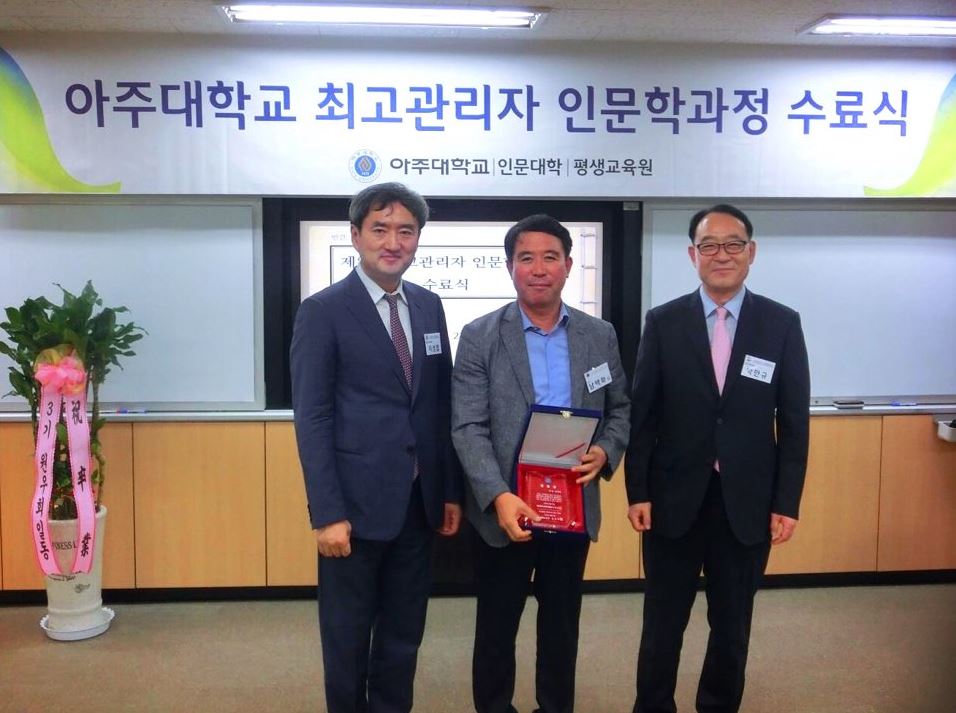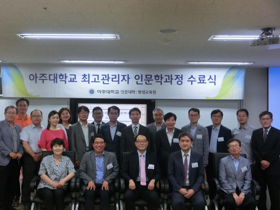 ‘인간, 상상의 나래를 펴다’ 6월 27일, 제5기 최고관리자 인문학과정이 14주간의 여정을 끝내고 수료를 맞이했다. 제5기 최고관리자 인문학과정은 ‘인간과 상상력’을 주제로 공사기업의 최고경영자, 정부 인사, 금융·법조·의료 등 전문직 종사자 등을 대상으로 △공통 테마가 있는 강의 △나를 찾는 고전텍스트 공부 △한국의 전통과 지역문화 학습 △인문 경영능력 함양 등의 교육 과정을 진행하였다. 이번 수료식에는 5기 최고과정 원우 22명을 비롯하여 1~4기 원우 4명과 박만규 인문학아카데미아원장, 이성엽 평생교육원장, 김종식 사학과 교수, 박구병 사학과 교수 등 관계자가 수료식에 참석하여 자리를 빛내주었다. 수료식은 박만규 인문학아카데미아원장의 격려사, 이성엽 평생교육원장의 축사, 수강 소감 발표 등으로 진행되었으며 5기 원우 22명이 수료하였다. 또한 부단히 5기 원우회를 이끌어준 남택화 회장 및 최재성 총무가 공로상을 수상하였으며, 성실히 수업에 참석하여 타의 모범이 되어준 최문정, 유영호 최고과정 원우가 특별상을 수상하였다. 경기지방경찰청 제1부장이자 이번 5기 회장인 남택화 원우는 “항상 새로운 생각을 할 수 있게 해주어 최고위 인문학과정에 감사한다. 또한, 사회 각 층의 멋지고 교양있는 여러분을 만날 수 있어 무한한 영광이다” 말하며 수강소감을 밝혔다. 한편, 제6기 최고관리자 인문학과정은 9월에 개강하며 자세한 사항은 아주대학교 인문대학(031-219-2801), 평생교육원(031-219-3583)으로 문의하면 된다.