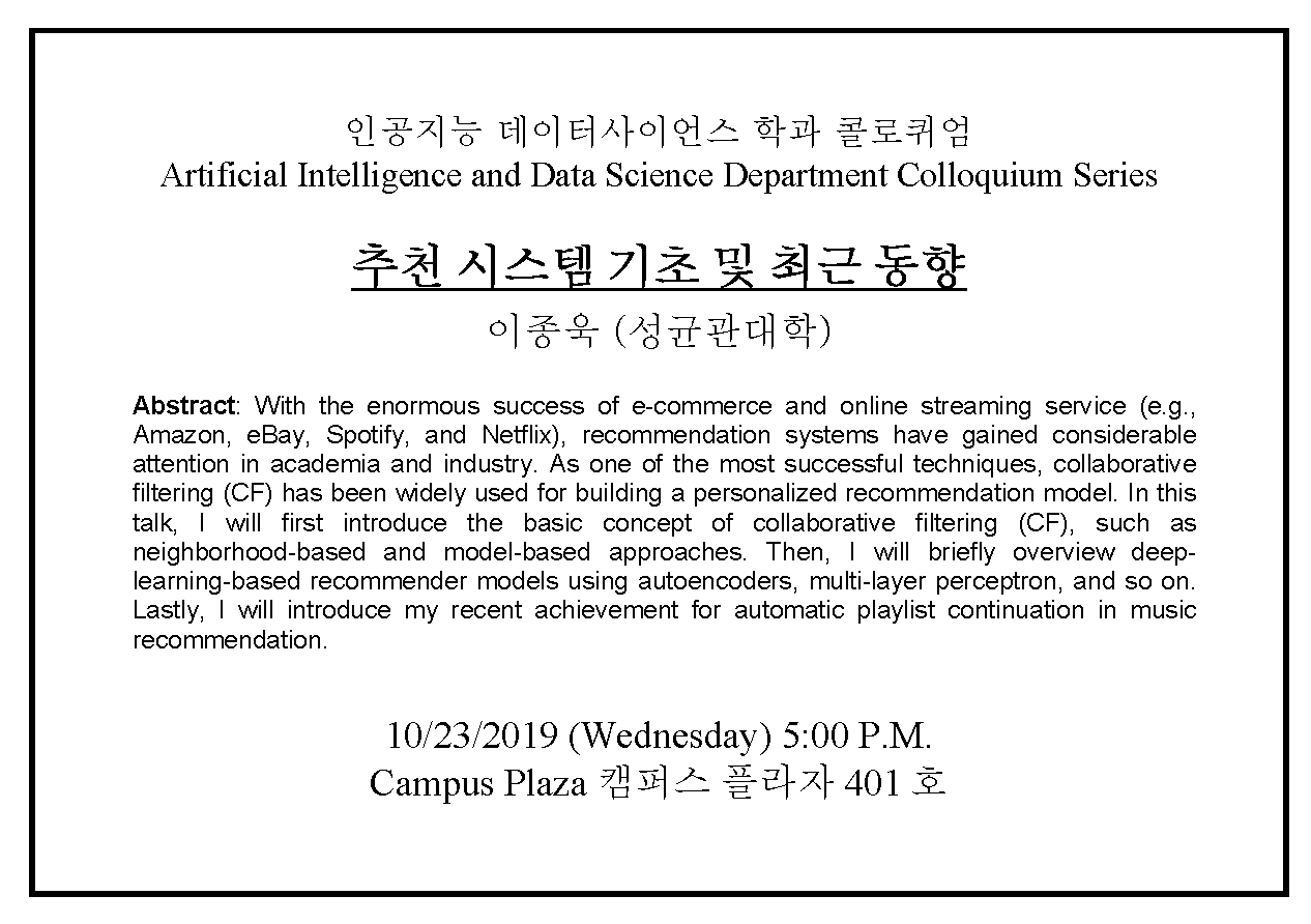 | 8991 | 학술 | 인공지능데이터사이언스학과 | 2019-10-17 | ||