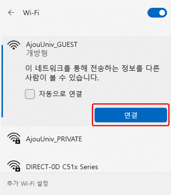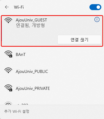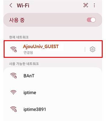 2. Wi-Fi SSID 목록 중 “AjouUniv_GUEST” 연결 클릭