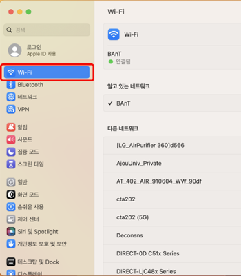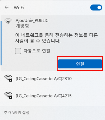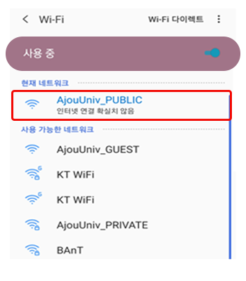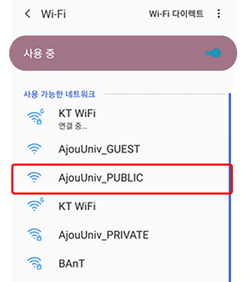 2. Wi-Fi SSID 목록 중 “AjouUniv_PUBLIC” 연결 클릭
