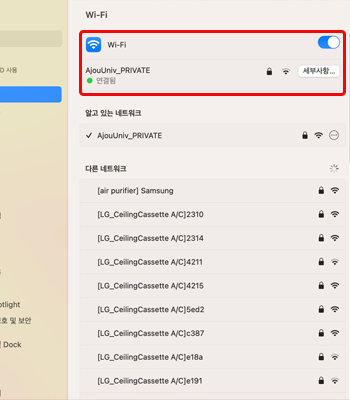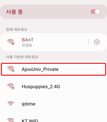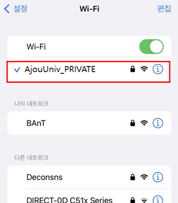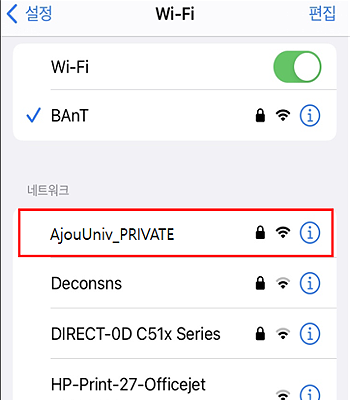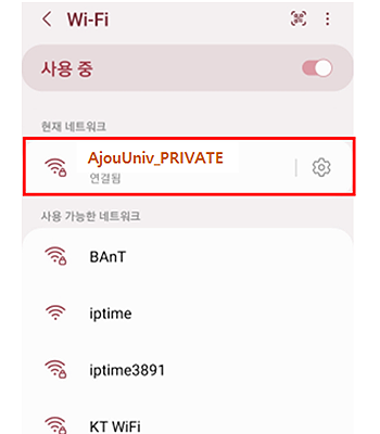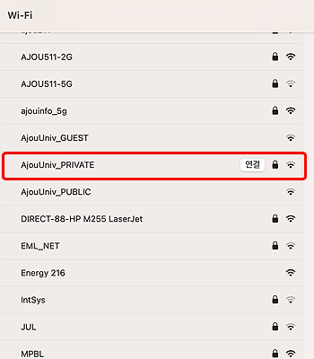 4. Wi-Fi SSID 목록 중 “AjouUniv_PRIVATE” 클릭