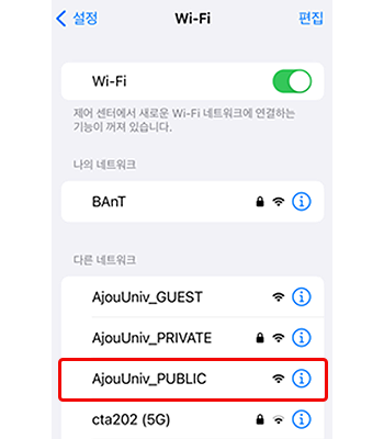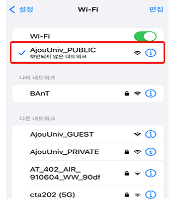 3. Wi-Fi SSID 목록 중 “AjouUniv_PUBLIC” 클릭