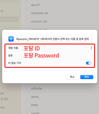 3. Wi-Fi SSID 목록 중 “AjouUniv_PRIVATE”,