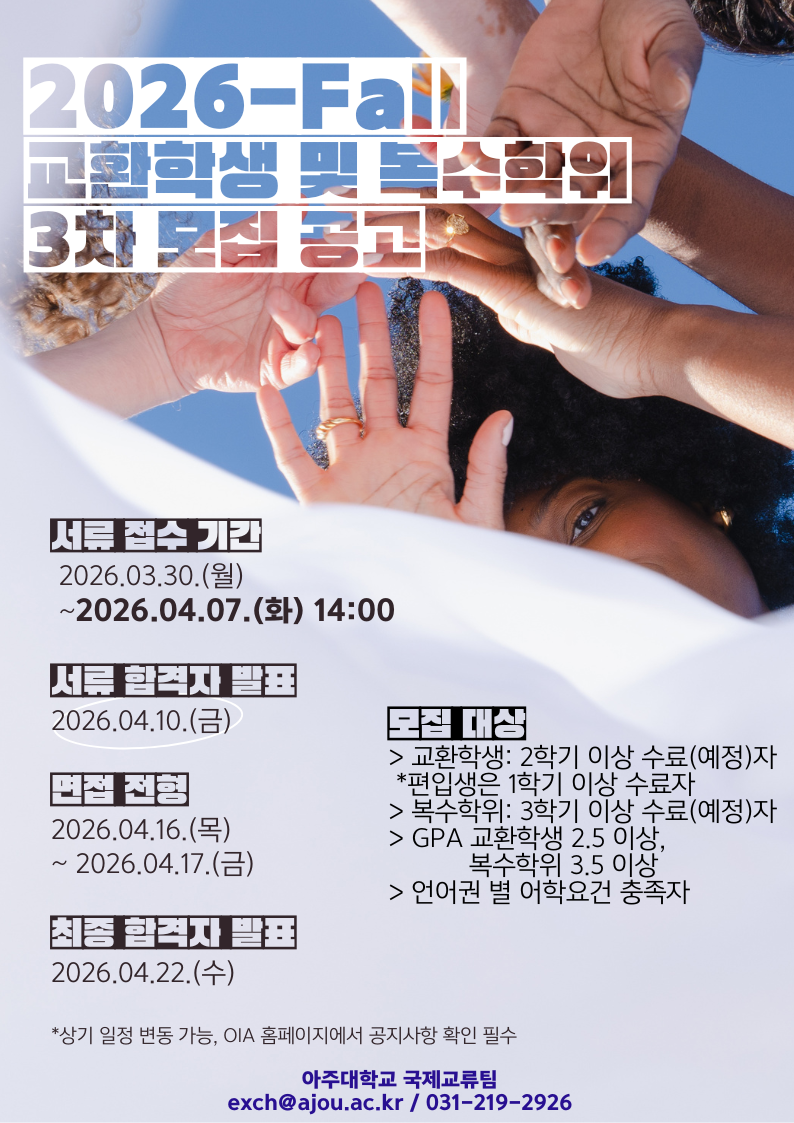 2026-2학기 파견 교환학생 및 복수학위생 3차 모집을 안내하오니, 붙임의 모집요강을 꼼꼼하게 참고하시어 관심 있는 학생들의 많은 지원 바랍니다.